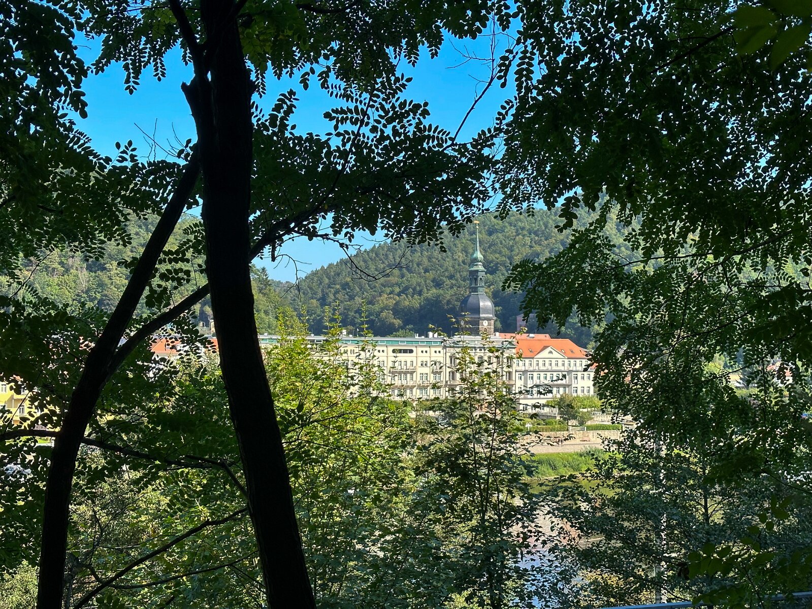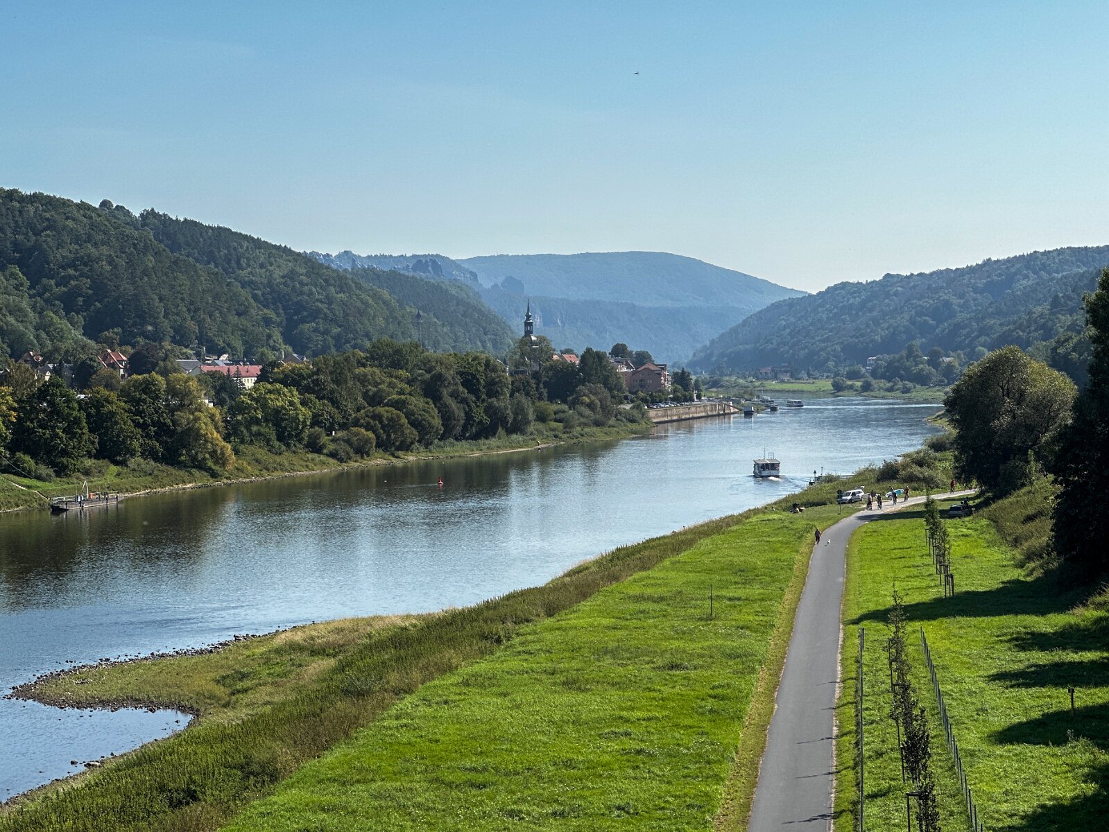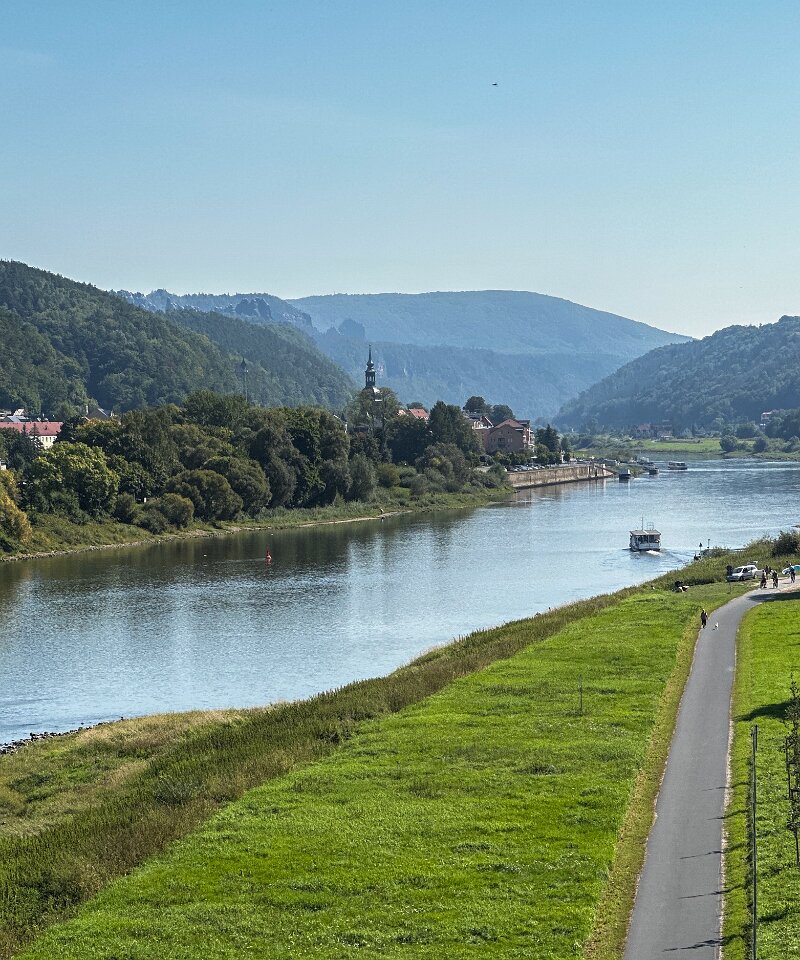 Bad Schandau von der Elbbrücke (da gibt es nicht so viel davon, meist fahren kleine Fähren über den Fluss, für Fußgänger und Radler)