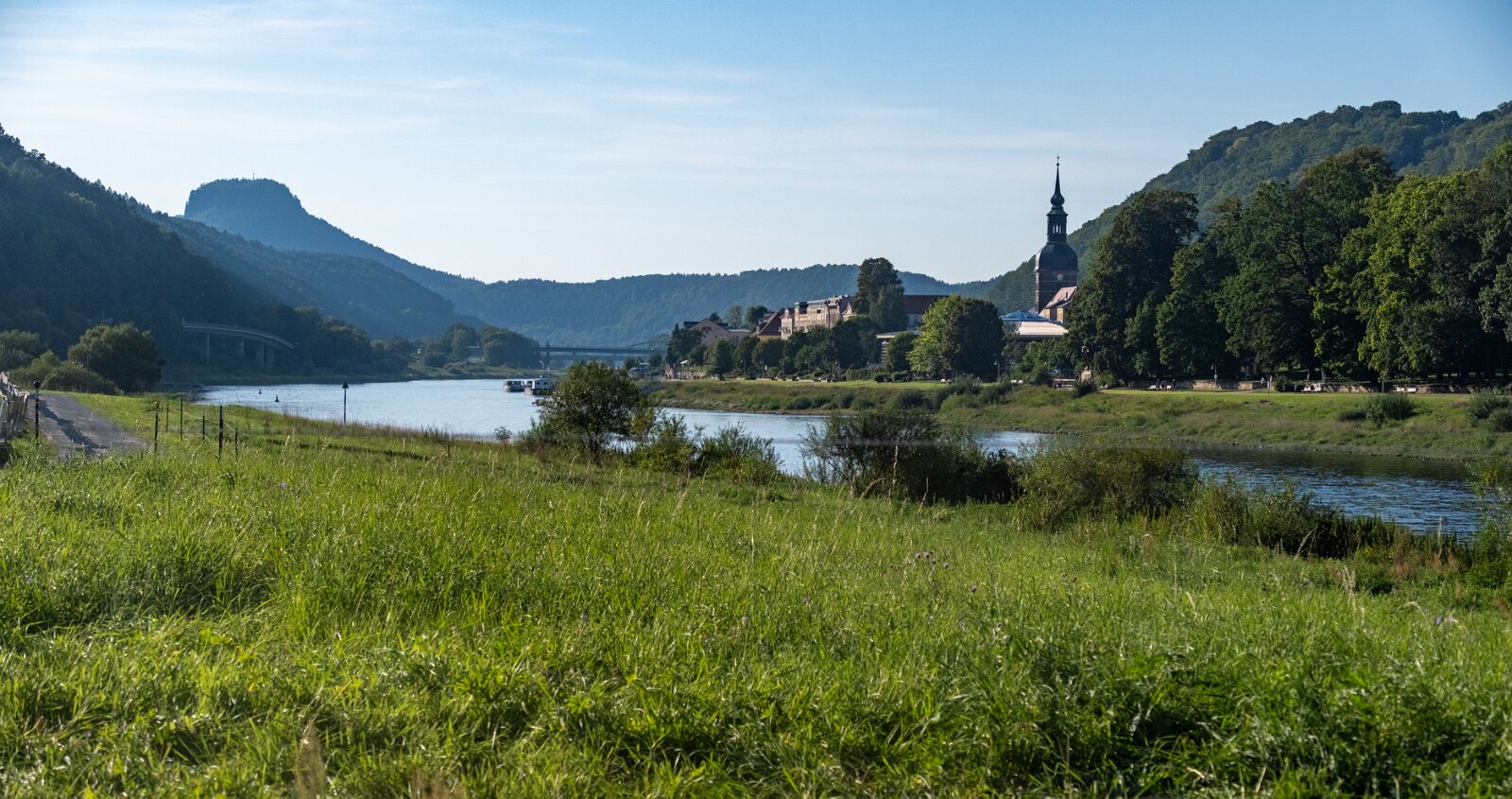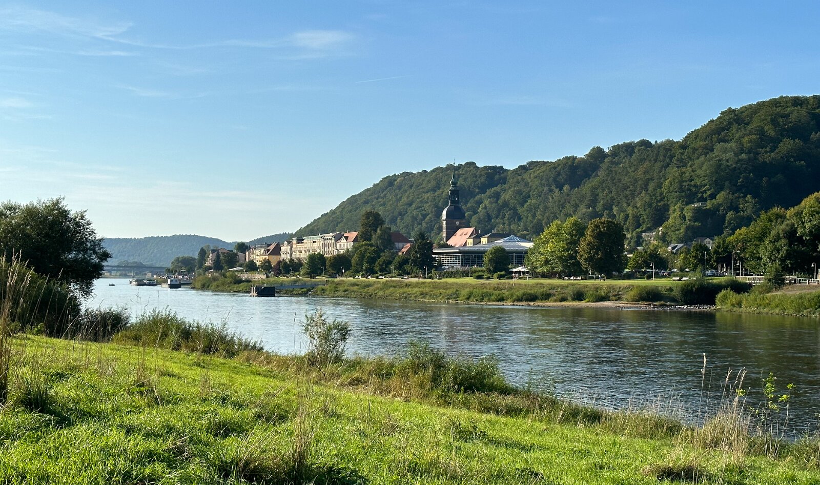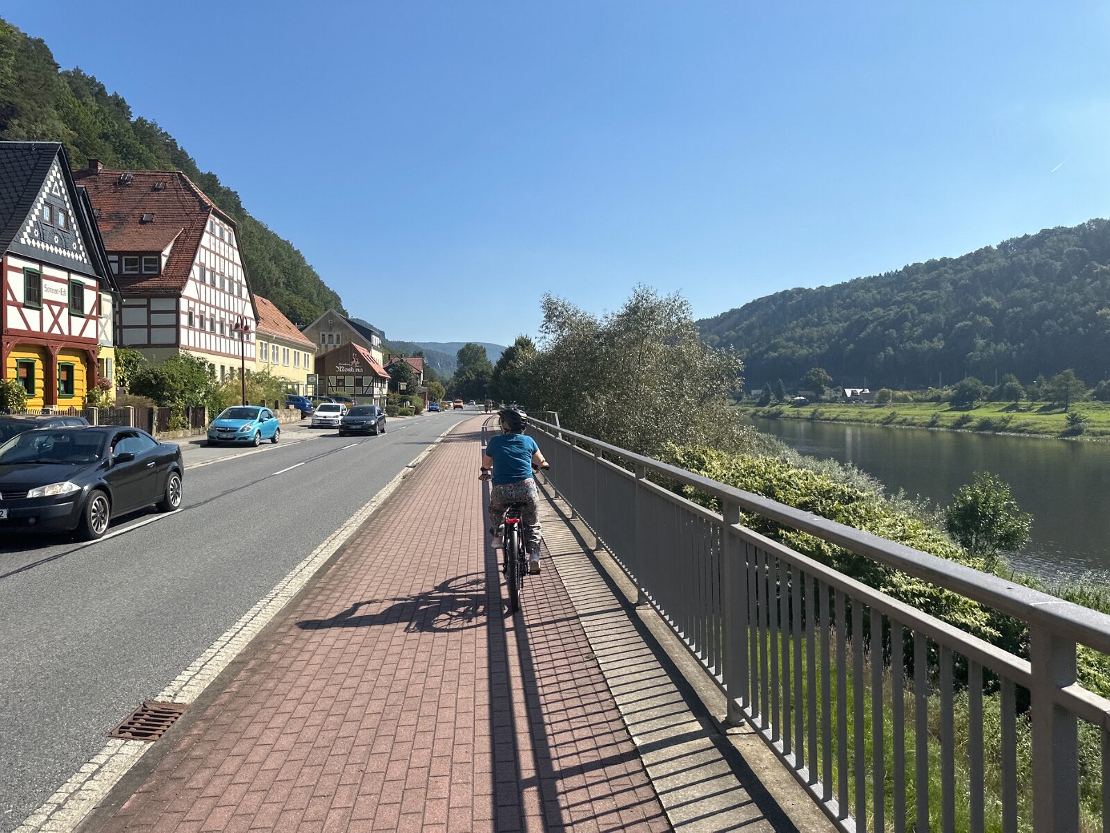 Bad Schandau von der Elbbrücke (da gibt es nicht so viel davon, meist fahren kleine Fähren über den Fluss, für Fußgänger und Radler)